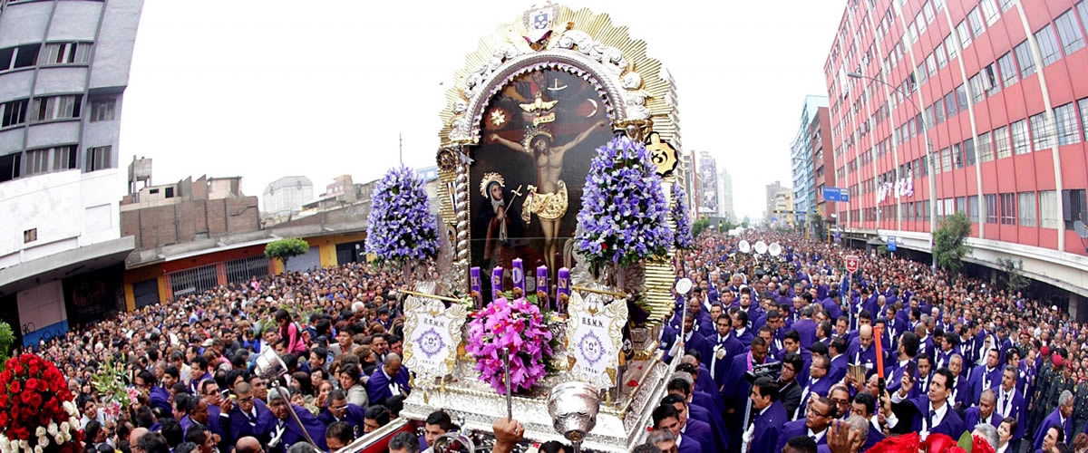 Considerada como la mayor procesión católica del mundo, la festividad del Señor de los Milagros es el acto de veneración a la imagen del Cristo en la Cruz pintada en una pared del santuario de las Nazarenas, en el centro de Lima, por un esclavo angoleño. La imagen original ha resistido el paso de terremotos y el tiempo.